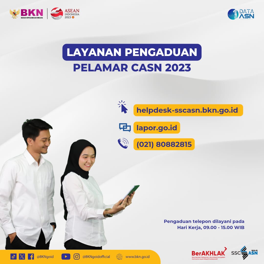 Untuk mendukung kelancaran proses pendaftaran seleksi CASN 2023 pada portal SSCASN BKN via _https://sscasn.bkn.go.id_, BKN telah menyediakan layanan Helpdesk bagi pelamar. Pelamar dapat memanfaatkan layanan Helpdesk untuk menyampaikan kendala teknis pendaftaran melalui 3 (tiga) alternatif kanal layanan yang disediakan, yakni *_helpdesk-sscasn.bkn.go.id_; lapor.go.id; dan layanan telepon*. Selain itu BKN juga secara proaktif menyediakan informasi berkala terkait seleksi di kanal media sosial dan website.
