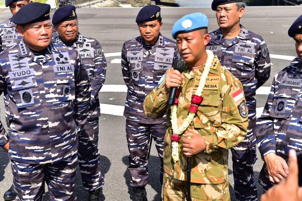 Laksamana Yudo dalam sambutannya menyampaikan ucapan selamat datang kepada prajurit-prajurit Jalasena Samudera yang telah bertugas melaksanakan Maritime Task Force selama satu setengah tahun di Lebanon. “Saya ingat pada 5 Maret 2021, saya melepas kalian di Batam, sekarang saya menyambut kalian semuanya dalam keadaan sehat wal’afiat. Suatu kebanggaan menjadi prajurit Jalasena Samudera, dimana peran prajurit di MTF membawa citra baik pada jajaran TNI AL, karena tugas yang kalian emban tanpa cacat selama misi perdamaian dunia di Lebanon, kebanggaan itu ditunjukan pula oleh negara-negara peserta MTF kepada TNI AL,” kata Kasal.