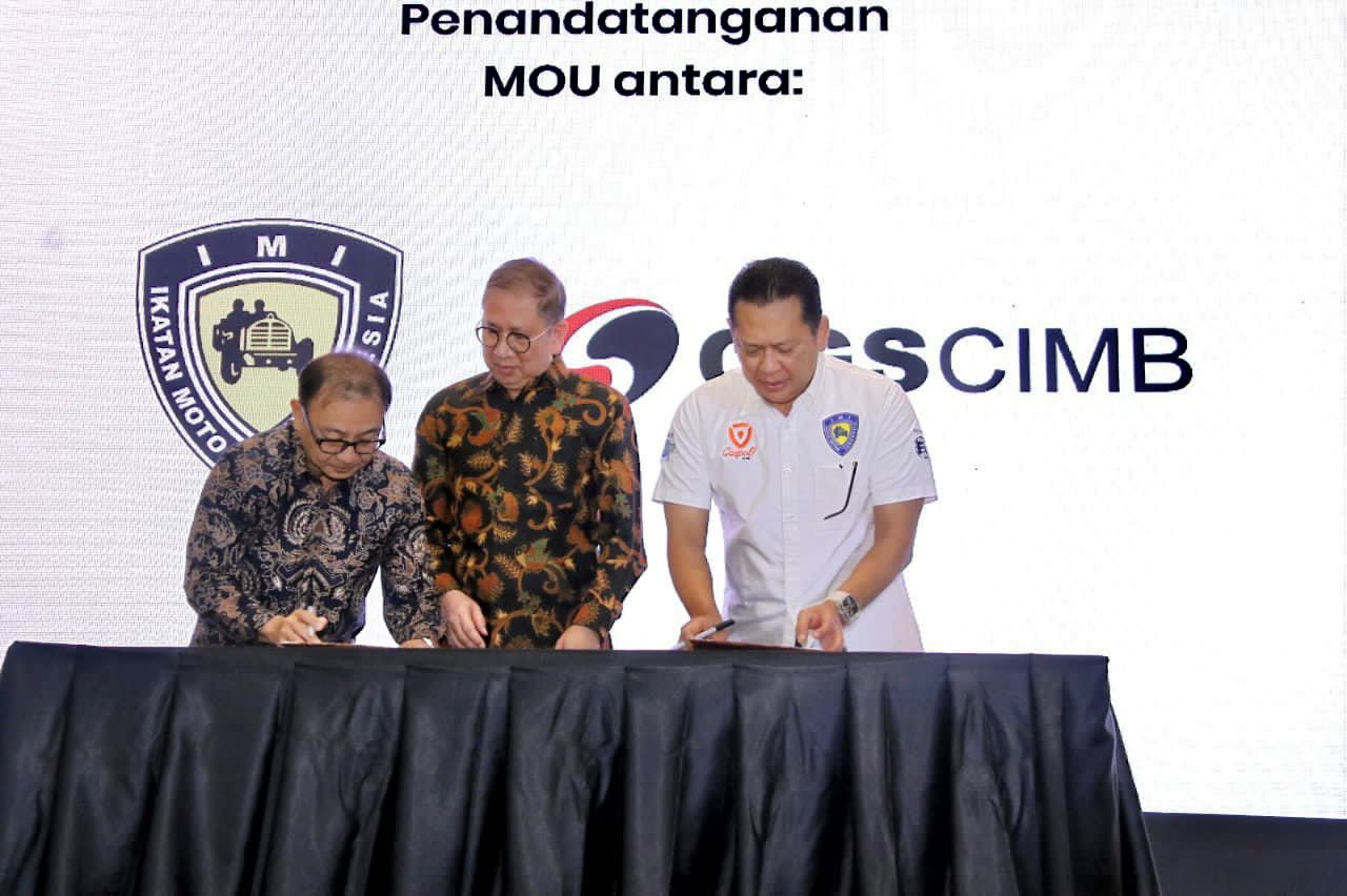 JAKARTA (HSB)- Ketua MPR RI sekaligus Ketua Umum Ikatan Motor Indonesia (IMI) Bambang Soesatyo bersama Presiden Direktur PT CGS CIMB Sekuritas Indonesia (CGS-CIMB) Lim Kim Siah dan Direktur CGS CIMB Sugiharto Widjaja menandatangani nota kesepahaman antara IMI dengan CGS-CIMB. Melalui nota kesepahaman tersebut, CGS-CIMB yang merupakan perusahaan efek yang telah memperoleh izin sebagai Perantara Pedagang Efek, akan menjadi salah satu merchant di aplikasi Gaspol! milik IMI.