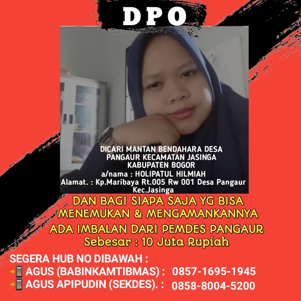 Adapun warga Masyarakat Desa pagaur, Kecamatan Jasinga,beramai-ramai inisiatif membuat banner bertuliskan, “DPO DICARI MANTAN BENDAHARA DESA PANGAUR KECAMATAN JASINGA KABUPATEN BOGOR.” Atas Nama : holipatul hilmiah Alamat Kp Maribaya Rt 005, Rw 001, Desa Pagaur, Kecamatan jasinga. dan bagi siapa saja yang bisa