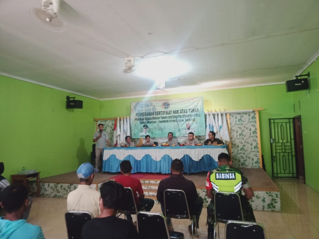 Kades Desa Srimahi Sudarto Menyampaikan Bahwa Belum adanya jaminan kepastian hukum atas tanah seringkali memicu terjadinya sengketa dan perseteruan atas lahan di berbagai wilayah di Indonesia, Selain di kalangan masyarakat, baik antar keluarga, tak jarang sengketa lahan juga terjadi Hal itu membuktikan pentingnya sertifikat tanah sebagai tanda bukti hukum atas tanah yang dimiliki.” Kata Sudarto saat Melakukan Penyerahan Sertifikat Tanah di Aula Balai Desa Srimahi Kampung Pulo puter, RT. 004/002 Selasa 4/10/2022.