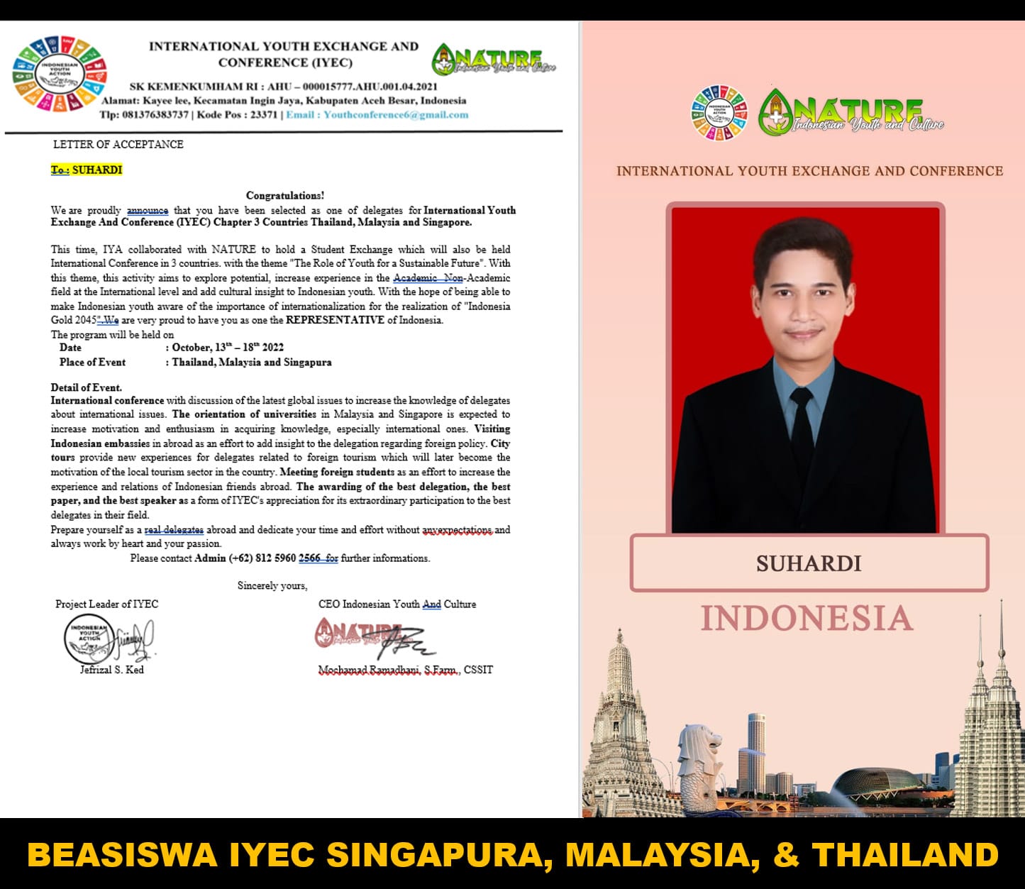 Riau (HSB)- Membanggakan, Suhardi berhasil mendapatkan beasiswa penuh menjadi perwakilan Indonesia sebagai Delegasi International Youth Exchange and Conference (IYEC) ke 3 Negara (Malaysia, Thailand, dan Singapore).