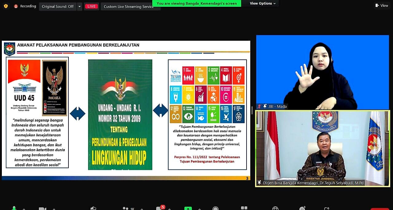 JAKARTA (HSB) – Direktur Jenderal Bina Pembangunan Daerah Kementerian Dalam Negeri Teguh Setyabudi memberikan arahan kepada pemerintah daerah dalam sosialisasi Peraturan Presiden Nomor 111 Tahun 2022 tentang Pelaksanaan Pencapaian Tujuan pembangunan Berkelanjutan (TPB/SDGs), yang diselenggarakan oleh Kementerian PPN/Bappenas pada Selasa (18/10/2022).