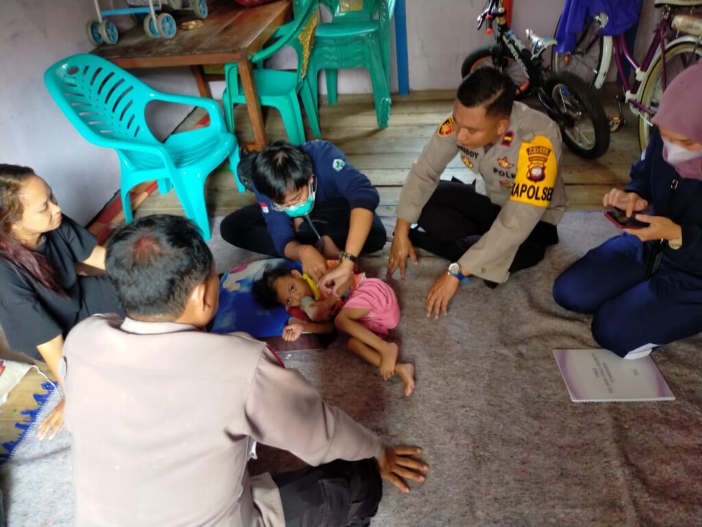 Kubu Raya, Kalbar (HSB) – Salah satu bentuk kepedulian dan perhatian serta dukungan dari Polri dalam penanganan terhadap masalah stunting di Kecamatan Batu Ampar Kabupaten Kubu Raya, Kapolsek Batu Ampar IPDA Freddy Surya Purnama menyalurkan bantuan Sosial serta mengajak Dr. Putu Devara dari puskesmas Batu Ampar dan didampingi perawat Gizi melakukan pemerikasaan kesehatan kepada anak penderita stunting di salah satu rumah warga di Jalan Damai RT 07/RW 04 desa Batu Ampar, pada Jumat (21/10/22).