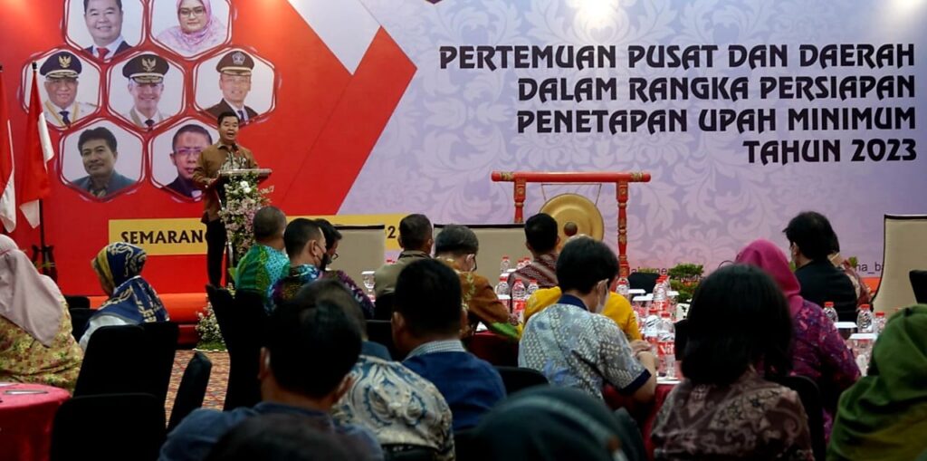 Teguh Setyabudi menjelaskan bahwa acara ini dipandang sangat strategis mengingat waktu penyesuaian dan penetapan UM jatuh pada pertengahan bulan November 2022. Pertemuan ini merupakan wadah bagi kita semua untuk meningkatkan koordinasi, komunikasi dan dukungan pemerintah daerah dalam implementasi Peraturan Pemerintah Nomor 36 Tahun 2021 tentang Pengupahan sehingga dapat tercipta hubungan industrial yang kondusif bagi peningkatan dan pemerataan pendapatan masyarakat, kesempatan kerja, lapangan berusaha dan daya saing daerah sebagaimana tujuan dari pembangunan daerah.