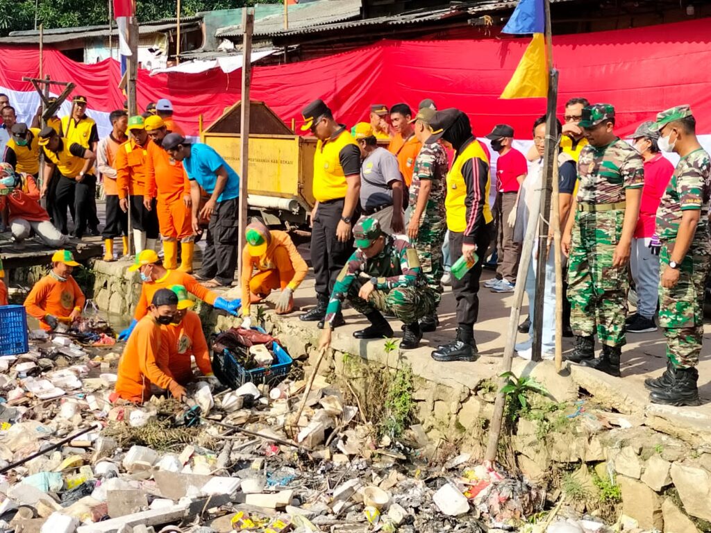 Pada kesempatan yang sama Dandim 0509 Letkol Inf Muhammad Horison Ramadhan turun langsung bergotong β royong membersihkan sampah yang berupa kayu kering dan potongan bambu yang menyumbat saluran air.