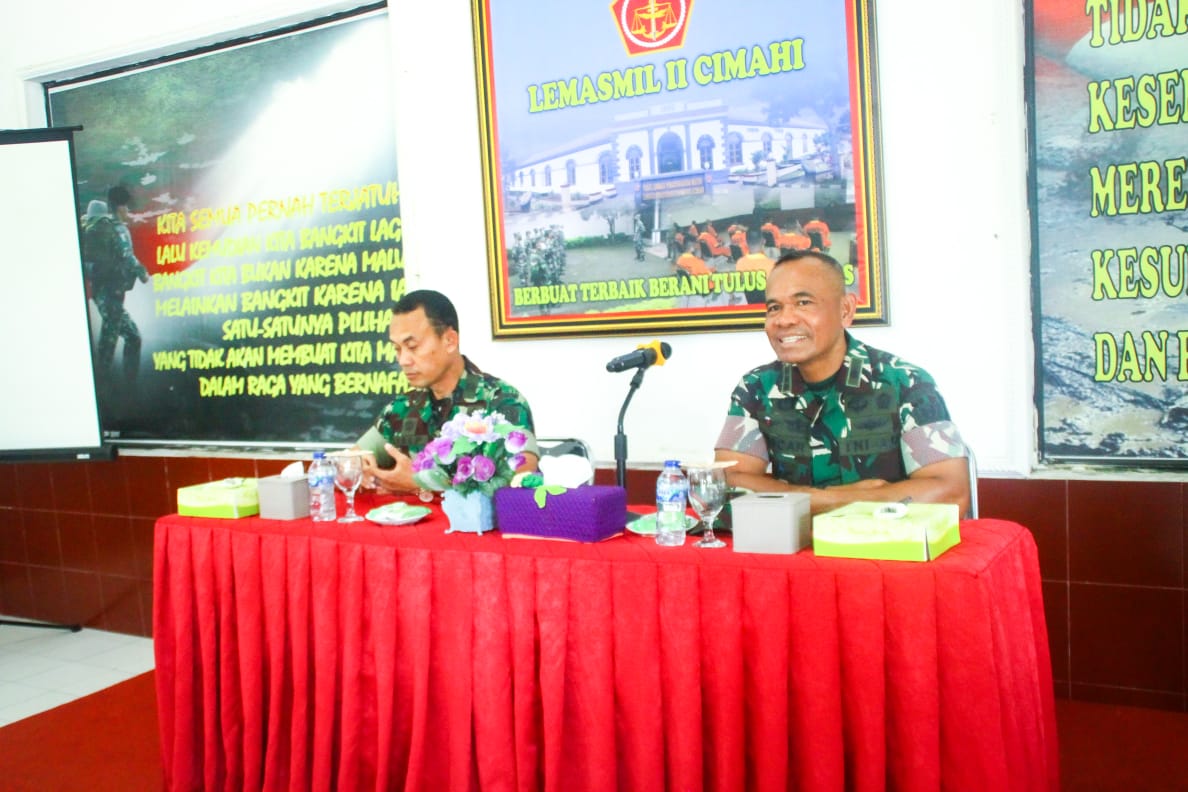 [JAKARTA] HSB – Komandan Pusat Pendidikan Peralatan (Danpusdikpal) Puspalad Kolonel Cpl Octovianus Oskar Engelberth, S.I.P melakukan kunjungan ke Lembaga Pemasyarakatan Militer (Lemasmil) II Cimahi, dan memberikan semangat serta motivasi kepada prajurit TNI yang sedang menjalani pembinaan dikarenakan tersangkut masalah hukum.