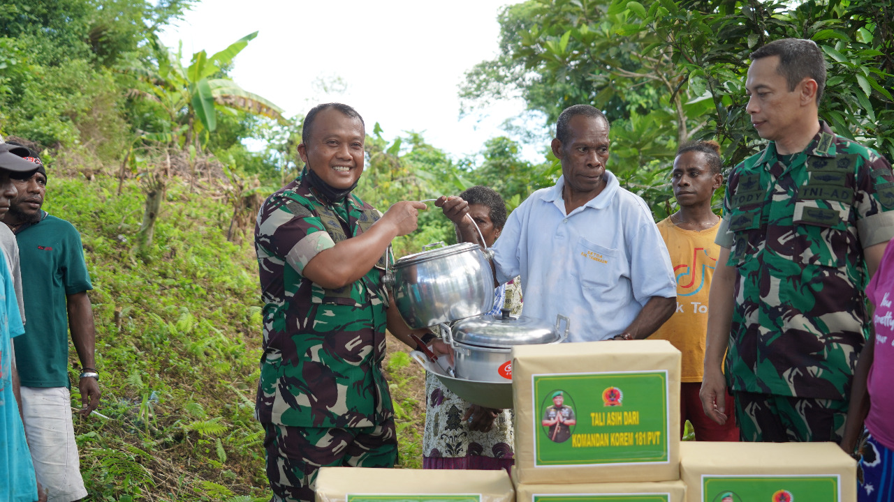 Sebelum meninggalkan Kampung Malaum, Danrem 181/PVT beserta rombongan dan warga masyarakat menikmati makanan yang dimasak oleh para Babinsa secara bersama-sama dan dilanjutkan pemberian alat perlengkapan dapur secara simbolis kepada warga masyarakat.