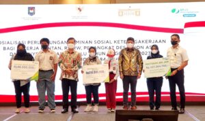 Acara dimaksud dihadiri oleh Deputi Bidang Koordinasi Peningkatan Kesejahteraan Sosial yang mewakili Menko PMK (online), Dirjen Bina Keuda Kemendagri, para Deputi di Kemenko PMK, KSP, Setkab dan Direktur SUPD IV Bangda Kemendagri, Direktur Kepesertaan Jamsos BPJS TK serta Pemprov (Biro Hukum, BPKAD, Bappeda, BKD) dan dihadiri lebih dari 1.000 peserta secara virtual oleh Pemkab/Pemkot dan BPJS TK.
