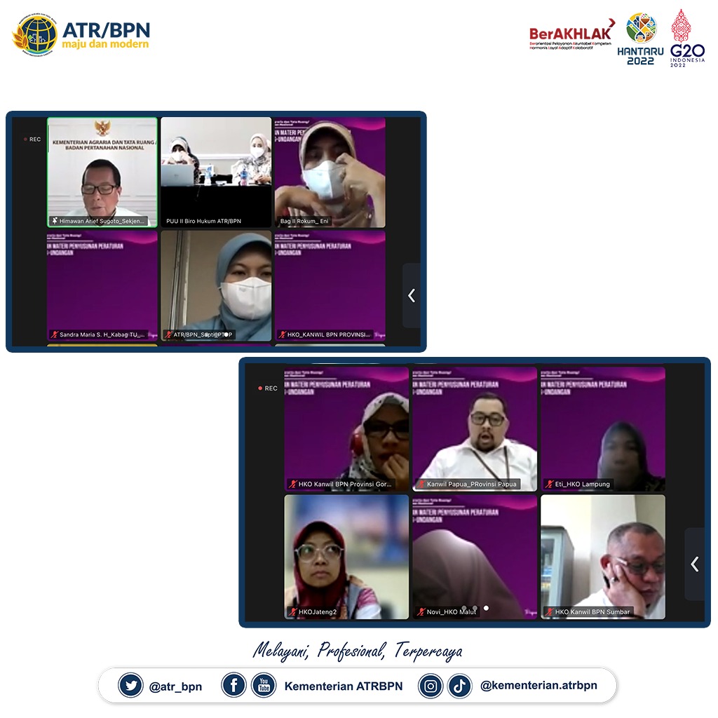 Adapun rapat ini dihadiri secara luring oleh Pejabat Pimpinan Tinggi Madya dan Pratama Kementerian ATR/BPN. Sementara itu, hadir secara daring Plt. Dirjen Peraturan Perundang-undangan Kementerian Hukum dan HAM, Dhahana Putra; Kepala Bagian Tata Usaha Kantor Wilayah (Kanwil) se-Indonesia; serta Kelapa Subbagian Hukum, Kepegawaian dan Organisasi Kantor Wilayah BPN se-Indonesia.