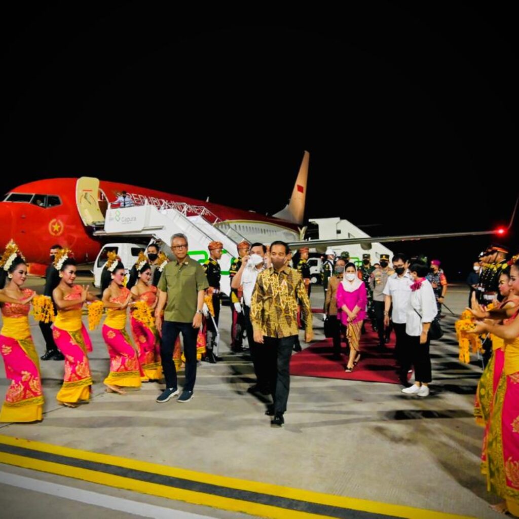 Setibanya di Bandara Internasional I Gusti Ngurah Rai, Kabupaten Badung, Presiden dan Ibu Iriana disambut seperti penyambutan resmi pemimpin negara G20. Turun di tangga pesawat, Presiden disambut pasukan jajar kehormatan dan tarian Bali di area tarmak.