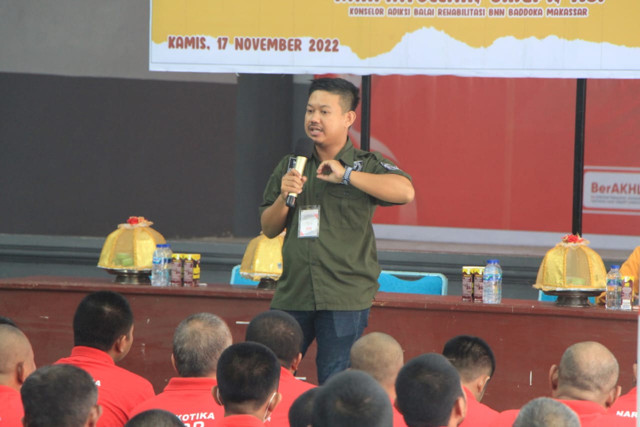Ratusan warga binaan Narkotika Lapas Makassar terlihat semangat menyimak materi dari Konselor Adiksi Balai Rehabilitasi BNN Badokka Makassar, Rahmatullah, yang menyebutkan klasifikasi zat narkotika berdasarkan efek buruk bagi kesehatan.