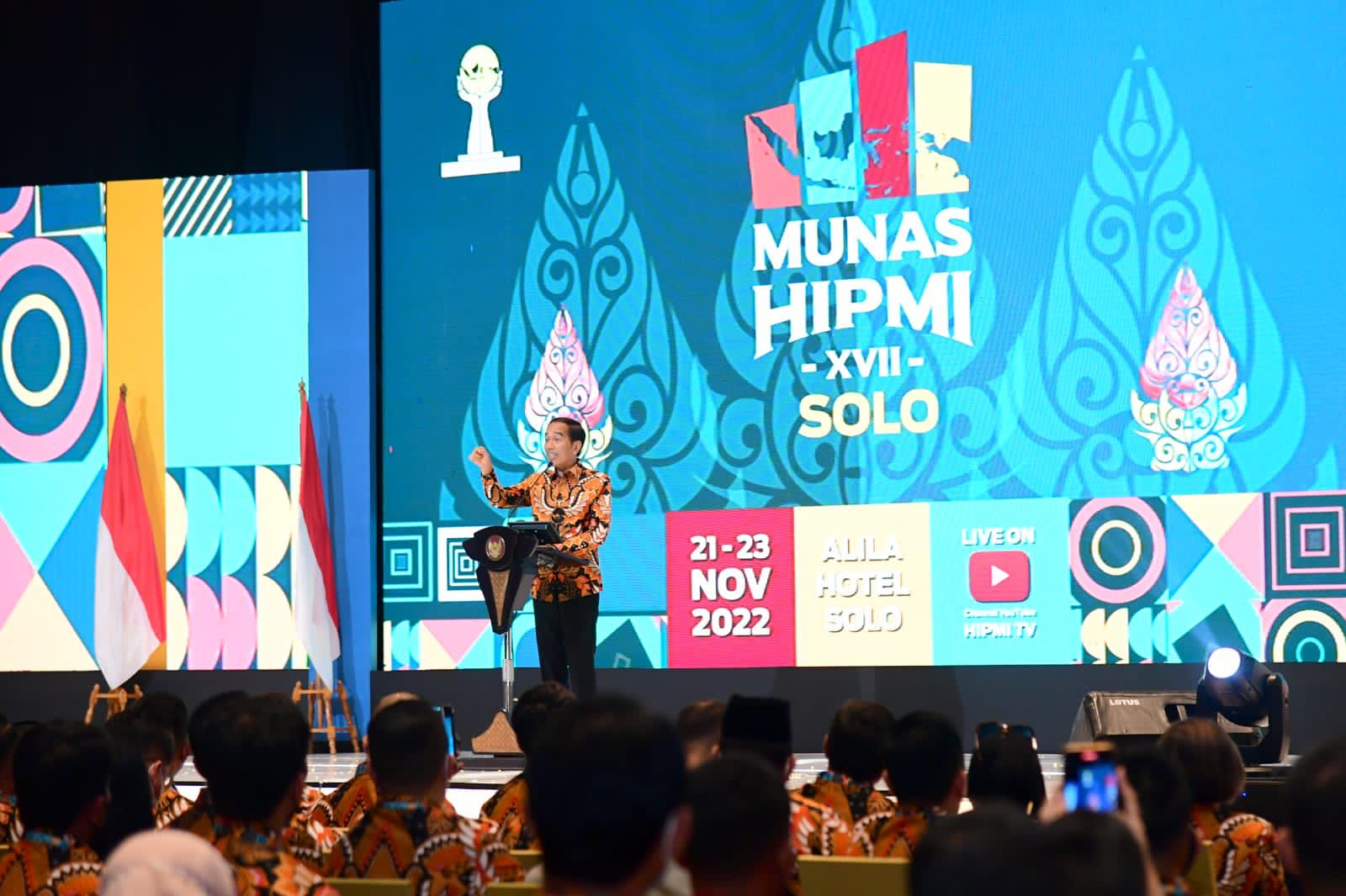 βKalau kita jadi pengusaha juga yang kita bangun adalah kepercayaan orang terhadap kita. Ini juga sebagai negara kita juga membangun kepercayaan internasional, kepercayaan global, kepercayaan negara-negara lain terhadap Indonesia,β ujar Presiden saat memberikan sambutan dalam Musyawarah Nasional Himpunan Pengusaha Muda Indonesia (Munas HIPMI) XVII yang digelar di Hotel Alila, Kota Surakarta, pada 21 November 2022.
