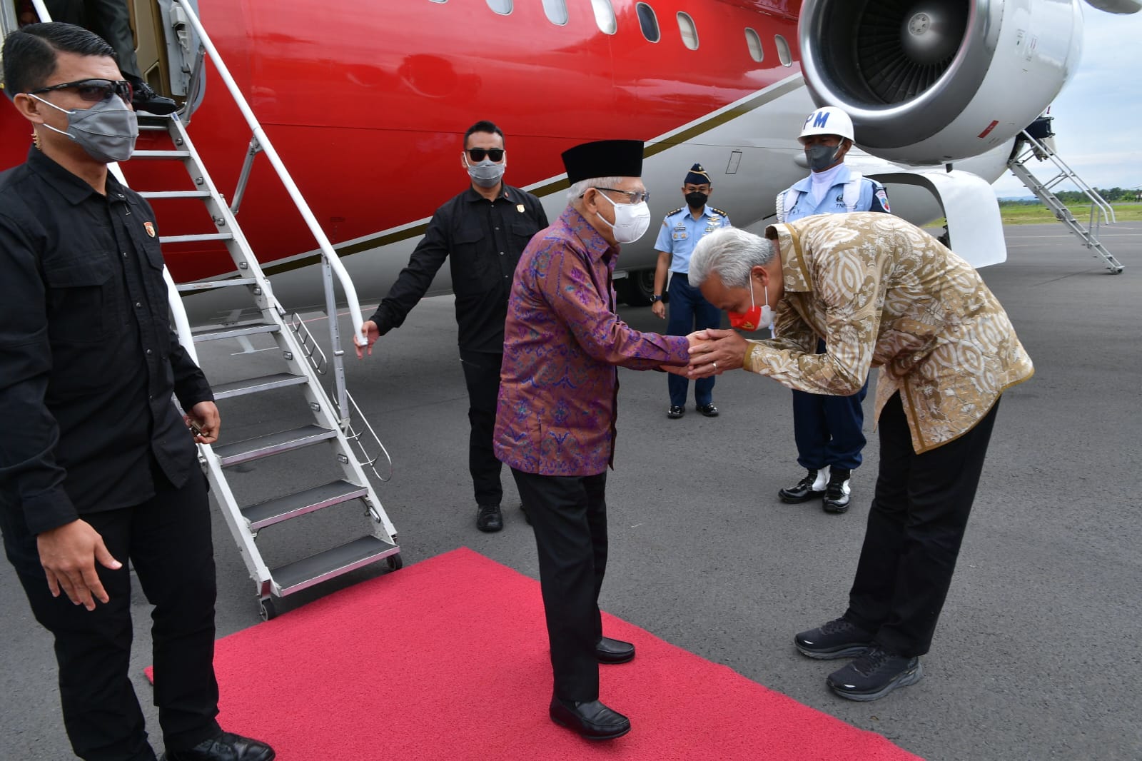 Setibanya di Pangkalan Udara TNI AU Jenderal Besar Soedirman Purbalingga, Wapres disambut oleh Gubernur Jawa Tengah Ganjar Pranowo, Pangdam IV/Diponegoro Widi Prasetijono,