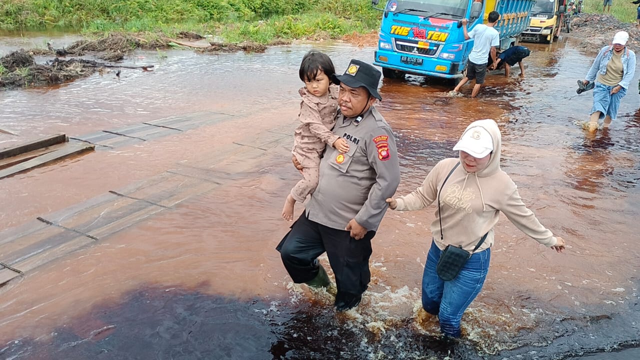 Ruas Jalan Pelang Terendam Genangan Air, Anggota Polsek Matan Hilir Selatan Sigap Bantu Warga