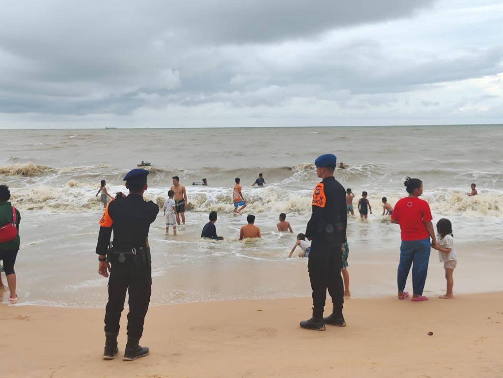 Singkawang Kalbar (HSB) – Tim SAR Satbrimob Polda Kalbar saat patroli himbauan kepada pengunjung pantai Pasir Panjang Singkawang selamatkan pengunjung yang tenggelam terseret arus ombak, Senin (2/1/23).