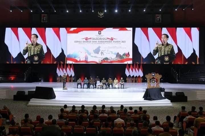 Bogor (HSB) – Presiden Joko Widodo secara resmi membuka Rapat Koordinasi Nasional (Rakornas) Kepala Daerah dan Forum Komunikasi Pimpinan Daerah (Forkopimda) Se-Indonesia Tahun 2023 yang digelar di Sentul International Convention Centre, Kabupaten Bogor, Provinsi Jawa Barat, Selasa, 17 Januari 2023. Dalam arahannya, Presiden antara lain mengajak para kepala daerah dan Bank Indonesia untuk bekerja keras menangani inflasi yang menjadi momok bagi semua negara.