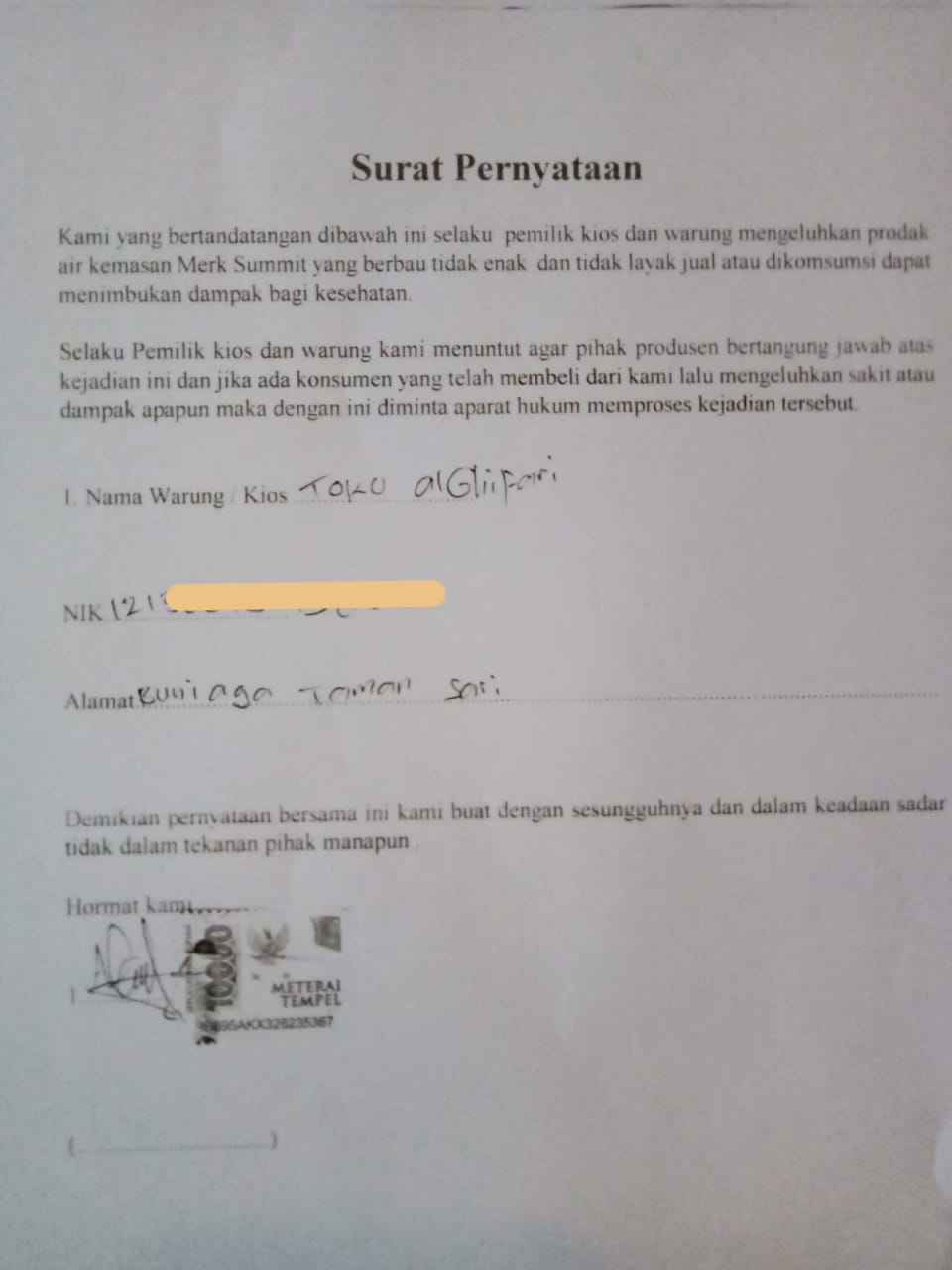 “Saat itupun pihak pabrik menyatakan akan melakukan uji lab atas sejumlah air kemasan yang dikeluhkan warga saat membeli diwarung kawasan Buniaga, Kecamatan Tamansari bahkan telah membuat pernyataan komplain secara tertulis disertai KTP dan materai,” terangnya.