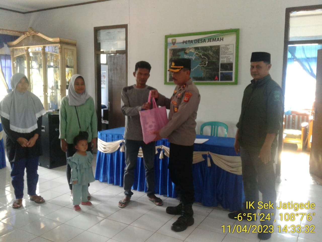 Kegiatan Bakti Sosial dilaksanakan sekitar pukul 14.00 WIB, dilaksanakan langsung oleh Kapolsek Jatigede Kompol Adang Rohana S.H., sebagai Bapak Asuh, dan dihadiri oleh Kepala Desa Jemah Iden Saepullah, Kasubag Program dan Keuangan Kec. Jatigede Sdri. Ai Hanifah Milati, SE., Bhabinkamtibmas Bripka Wanda Sonjaya, Bhabinkamtibmas Briptu Dede Nuryana, Bidan Desa Jemah dan Perangkat Desa Jemah