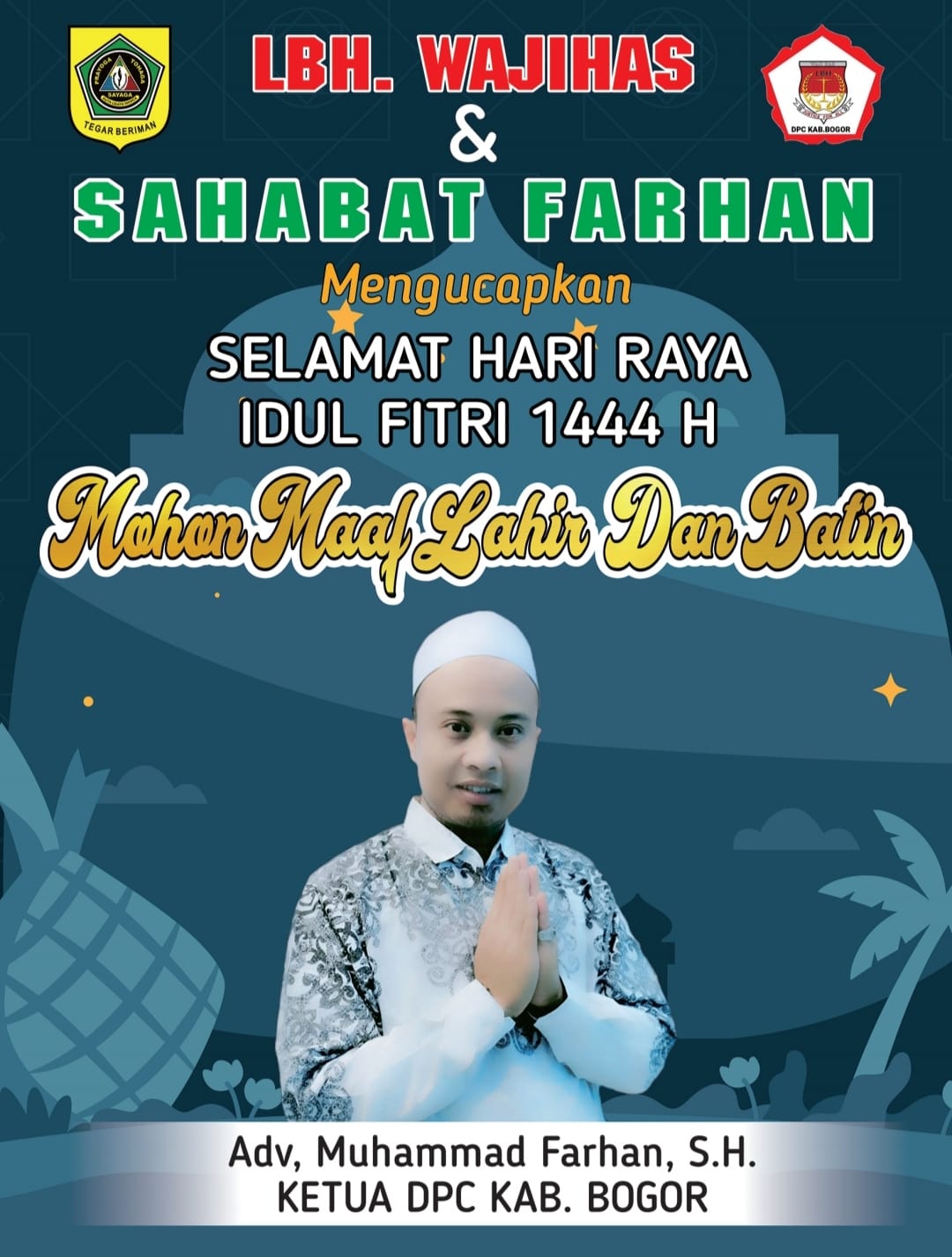 Bogor (HSB) – Adv, MUHAMMAD FARHAN S.H. Ketua DPC Kab Bogor LBH Wajihas dan KELUARGA BESAR SAHABAT FARHAN, mengucapkan Selamat Hari Raya Idhul Fitri 1444 H. Tiba nya Idhul Fitri 2023 sebentar lagi, tentu membuat umat islam bergembira dan ramai merayakan nya.