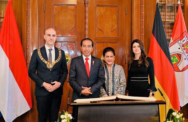 Harian Sinar Bogor || Presiden Joko Widodo dan Ibu Iriana Joko Widodo mengunjungi Town Hall Hannover, Jerman, pada Minggu, 16 April 2023. Tiba sekitar pukul 17.05 waktu setempat, Presiden Jokowi dan Ibu Iriana disambut oleh Wali Kota Hannover Belit Onay beserta istri, Derya Onay.