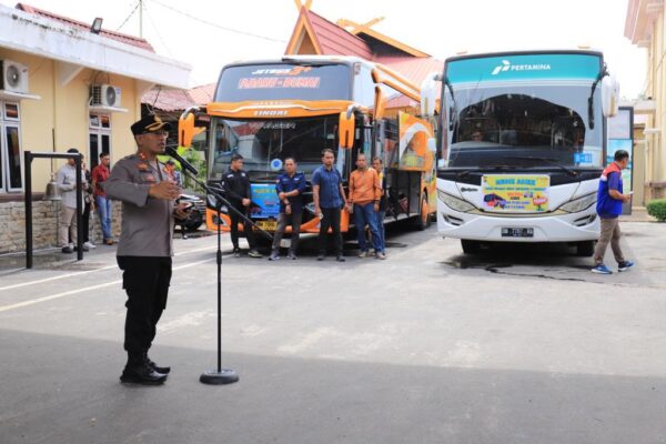 DUMAI (HSB) – Kapolres Dumai AKBP Nurhadi Ismanto SH SIK melepas perjalanan mudik gratis Idul Fitri 1444 H tujuan Kota Medan Provinsi Sumatera Utara dan Kota Padang Provinsi Sumatera Barat, Kamis (20/4/2023) di Halaman Mapolres.