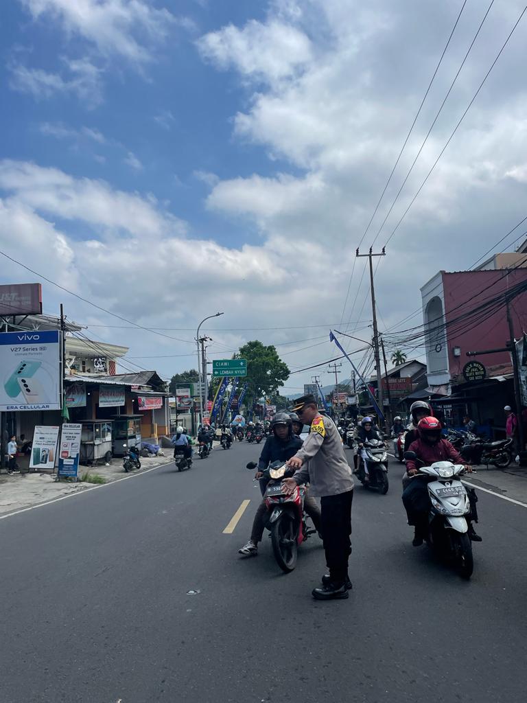 Polres Bogor (HSB) – Jaga kondisifitas arus lalu lintas di kawasan Cisarua Puncak, Kabupaten Bogor, Personil pengamanan operasi ketupat Lodaya 2023 Polsek Cisarua Polres Bogor Polda Jabar, gelar pengaturan arus lalu lintas di sekitaran Pasar Cisarua pada Senin, 24 April 2023.