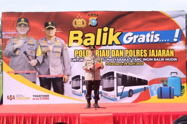 PEKANBARU (HSB) – Kapolda Riau, Irjen Pol Mohammad Iqbal secara ceremony melepas keberangkatan para pemudik untuk kembali ke daerah asalnya. Pelepasan digelar di Mapolda Riau, Sabtu 29 April 2023 pagi. Mudik balik ini diberikan gratis oleh kepolisian.