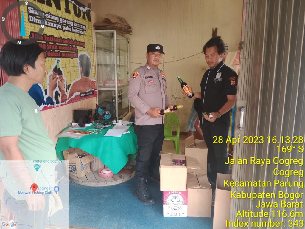 Pihak kepolsian Polsek Parung Polres Bogor Polda Jabar yang mendatangi lokasi yang menjadi tempat dijualnya minuman keras, pihak Kepolisian setelah menerima informasi dari masyarakat yang resah akan peredaran minuman keras beralkohol tersebut berhasil mengamankan sebanyak 79 botol minuman keras dari berbagai jenis dan merk.