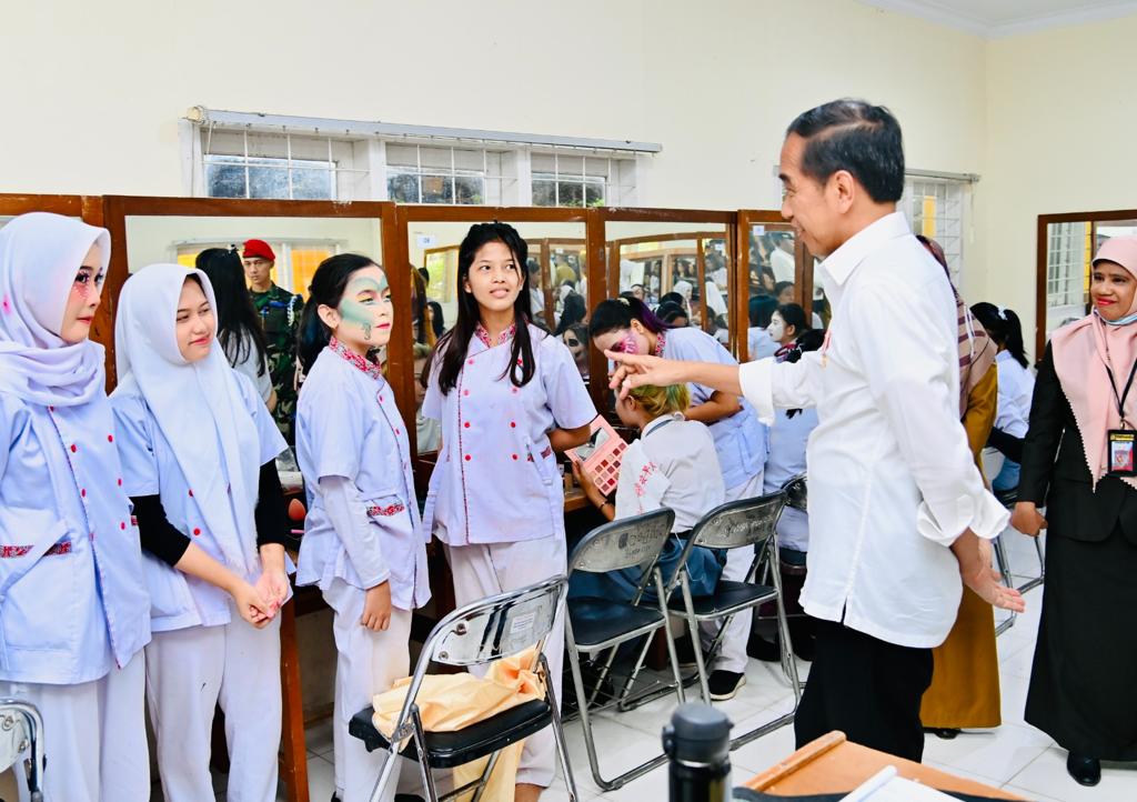 Jambi (HSB) – Presiden Joko Widodo meninjau kegiatan belajar mengajar di SMKN 4 Kota Jambi, Provinsi Jambi, pada Selasa, 16 Mei 2023. Di sekolah tersebut, Presiden melihat aktivitas siswa dan siswi yang sedang mengikuti kegiatan pembelajaran.