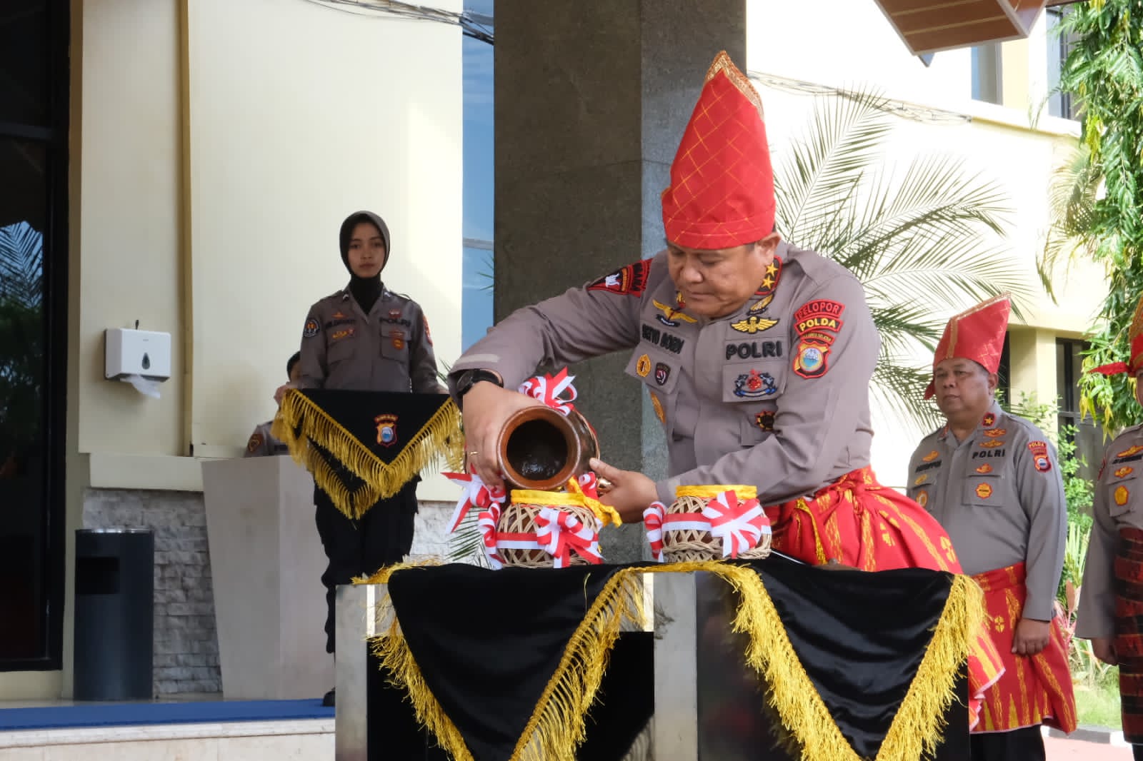 Acara tradisi penyerahan air suci dipimpin langsung oleh Kapolda Sulawesi Selatan Irjen Pol. Drs. Setyo Boedi Moempoeni Harso.,SH.,M.Hum di Mapolda Sulsel pada Rabu (14/6/2023). Untuk proses pengambilan air suci dilakukan personil Sat Brimob Polda Sulsel.