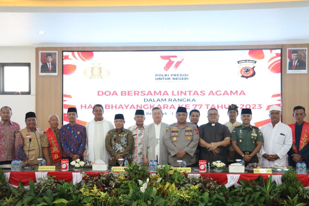 Kapolres Bogor AKBP Dr. Iman Imanuddin S.H.,S.I.K.,M.H mengatakan Bahwa kegiatan doa bersama lintas agama ini merupakan rangkaian menyambut hari Bhayangkara ke 77 tahun 2023. Mudah-mudahan dengan momentum hari Bhayangkara ini, kita berdoa dengan semua elemen masyarakat dari berbagai agama yang ada di Kabupaten Bogor akan lebih baik dalam Polri khususnya Polres Bogor dalam mengemban tugas penuh melindungi, mengayomi serta melayani masyarakat khususnya kabupaten Bogor menjaga kamtibmas Dengan rasa aman nyaman dan tertib.