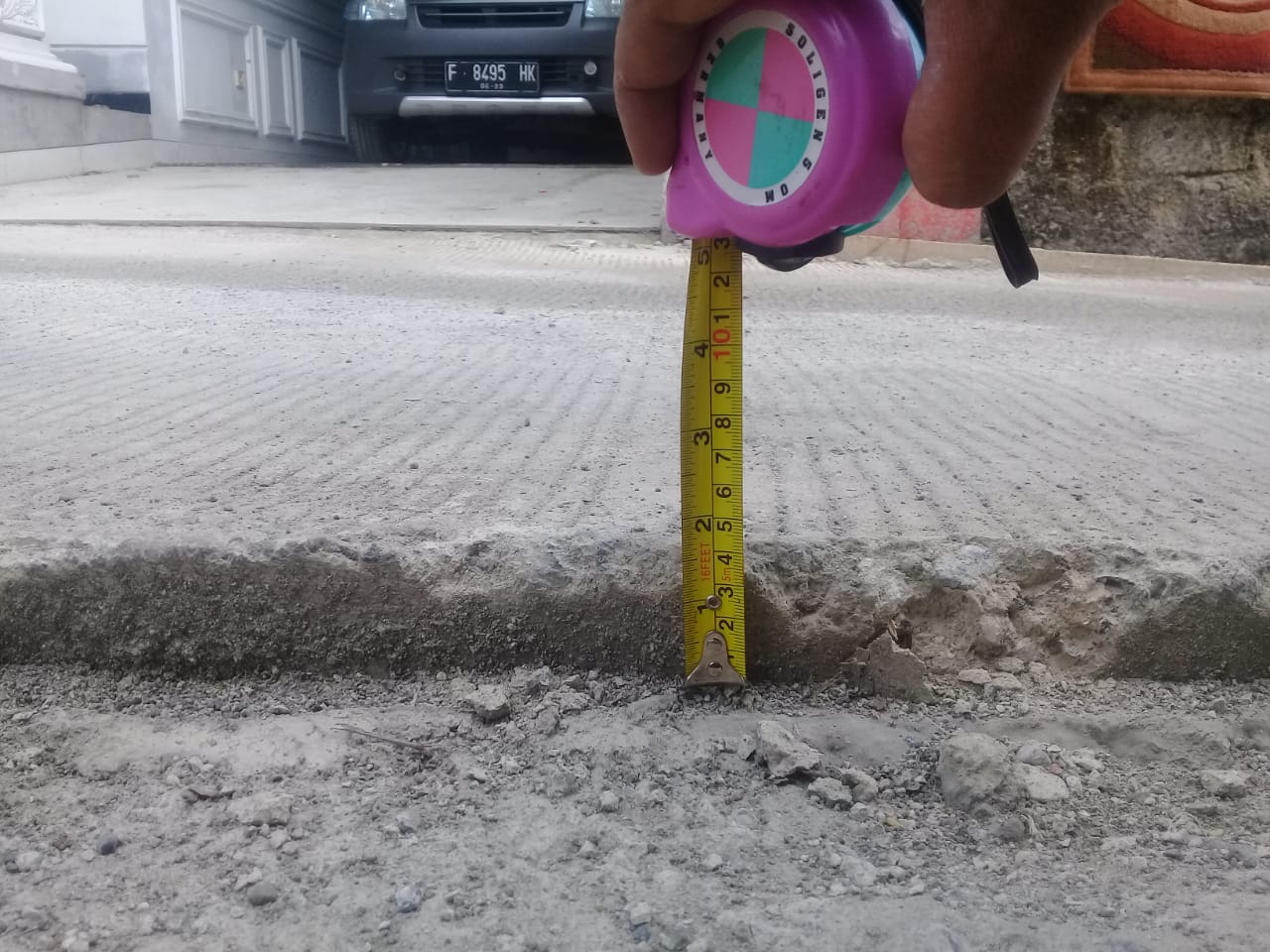 Dari hasil pengecekan lokasi oleh tim investigasi FJP2 jalan lingkungan tersebut dengan memakai alat ukur hasilnya sangat jelas dari ujung ke ujung jalan pun berdebu dan sudah rusak ketebalan betonisasinya pun tidak sesuai dengan papan informasi rata-rata cuma 5 cm dari hasil pengukuran terlihat jelas.