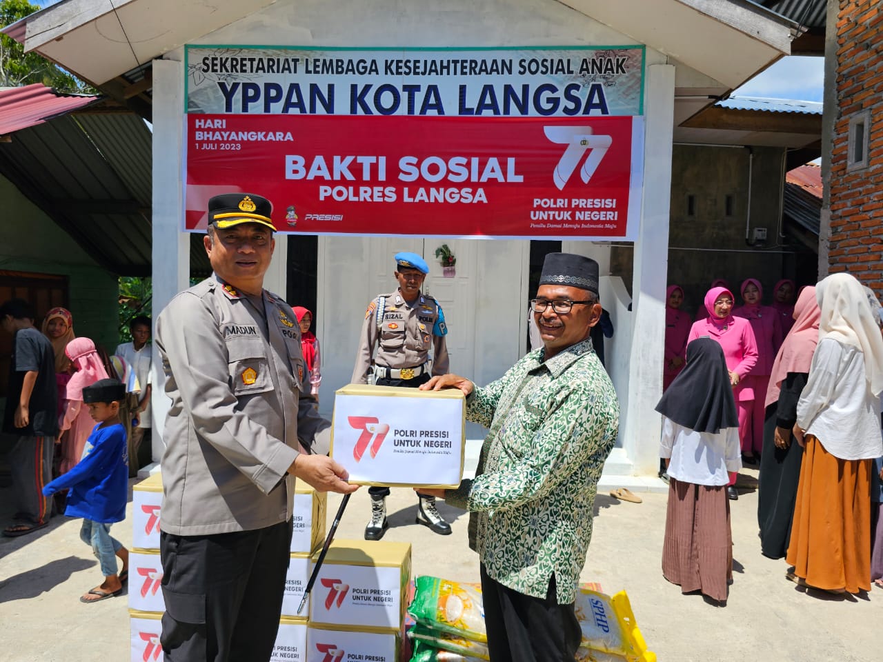 Langsa (HSB) – Dalam rangka menyambut Hari Bhayangkara ke-77, Polres Langsa melaksanakan kegiatan bakti sosial sebanyak 500 paket bantuan sosial, senin 19/6/23.