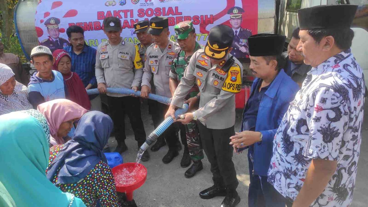 Sebelum acara Jum’at Curhat dimulai, Kapolres Sampang AKBP Siswantoro di dampingi Forkopimcam Pangarengan dan PJU Polres Sampang melaksanakan bhakti sosial penyaluran air bersih kepada masyarakat di halaman Masjid Al-Falah Desa Pacanggaan.