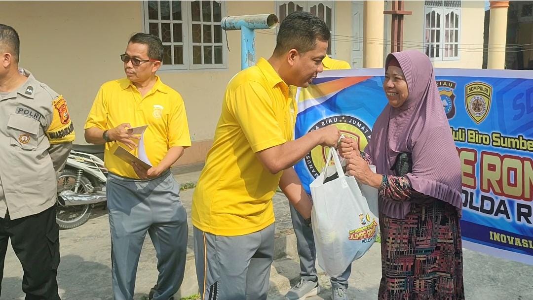 Pekanbaru (HSB) – Polda Riau melalui Satker Biro SDM (Biro Sumber Daya Manusia) kembali menggelar Jum’at Barokah yang lebih dikenal dengan nama JUMPE ROMANSA (Jumat Peduli Biro Sumber Daya Manusia) di sekitaran wilayah hukum Polda Riau.