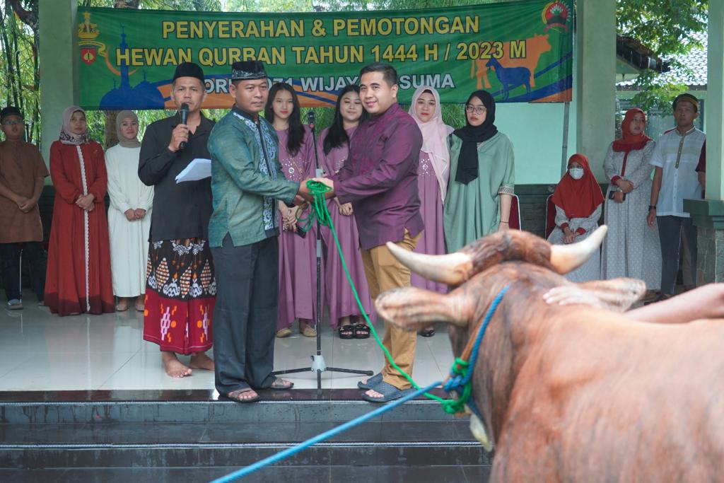 Seusai Sholat Idul Adha, Danrem 071/Wijayakusuma menyerahkan hewan qurban secara simbolis kepada Panitia hewan qurban dari Bintalrem 071/Wijayakusuma.