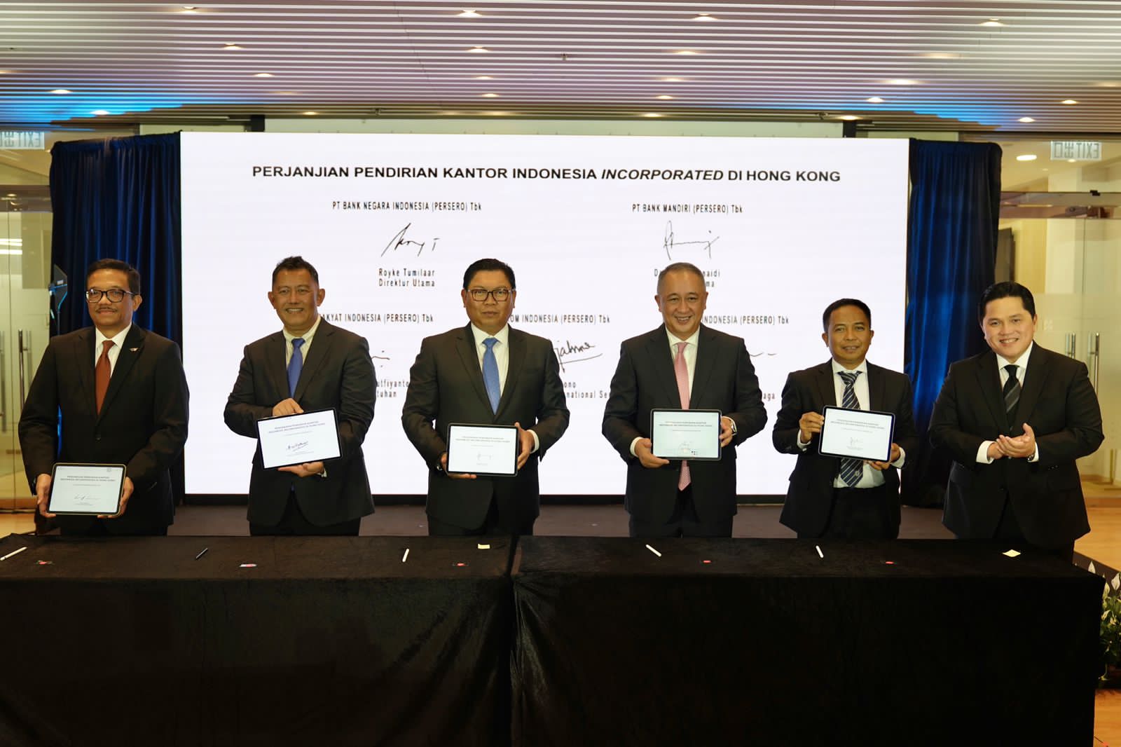 Hadir juga pada kesempatan tersebut jajaran direksi BUMN yang akan berbisnis dengan basis di Hong Kong. “Kami memilih Hong Kong karena sebagai pusat keuangan global, Hong Kong dapat memainkan peran penting dalam internasionalisasi BUMN Indonesia,” ujar Erick.