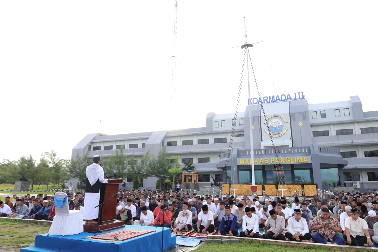 Sorong Papua Barat Daya (HSB) – Kaskoarmada III Laksma TNI Rudhi Aviantara melaksanakan sholat Idul Adha 1444 H di lapangan apel Mako Armada III, Katapop Kabupaten Sorong, Papua Barat, Sholat Idul Adha ini diikuti oleh seluruh Prajurit, PNS dan keluarga besar Koarmada III, serta Siswa Satuan Pendidikan 3 Sorong yang berlangsung dengan tertib dan khidmad. Bertugas sebagai imam sekaligus khatib sholat Idul Adha adalah Ustadz H. Samroni dari tokoh masyarakat Sorong.Kamis (29/06/23).