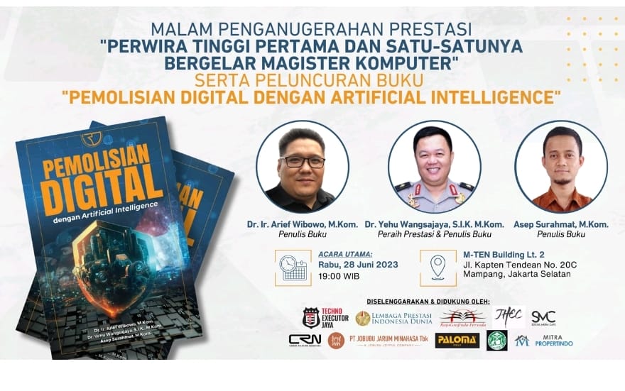 Dr. Yehu Wangsajaya, S.I.K., M.Kom. bersama dua sahabatnya, Dr. Ir. Arief Wibowo, M.Kom, dan Asep Surahmat, M.Kom., kemudian berkolaborasi menerbitkan buku “Pemolisian Digital dengan Artificial Intelligence” dan ternyata menjadi buku pertama dan satu-satunya di Indonesia tentang pemolisian digital berbasis kecerdasan buatan, yang diluncurkan tanggal 28 Juni 2023. Buku yang berbobot ini mendapatkan pengantar dari tokoh-tokoh besar baik akademisi, petinggi Polri hingga praktisi, mulai dari Prof. Muhammad Zarlis, M.Sc., (Guru Besar Bidang Ilmu Komputer dan Artificial Intelligence), Drs. Bekto Surapto, M.Si. (Pakar dan pemerhati Kepolisian), Irjen. Pol. Prof. Dr. Chrysnanda Dwilaksana, S.I.K., M.Si. (Kasespim Lemdiklat Polri dan Pakar Ilmu Kepolisian), Dr. Aqua Dwipayana, M.I.Kom. (Motivator dan Pakar Komunikasi terbaik di Indonesia), hingga Michael Sunggiardi (Pakar dan Praktisi TIK yang sangat berpengalaman di Indonesia). Gagasan dan inovasi terbaik tentang pemolisian digital dengan kecerdasan buatan dihadirkan secara lugas dan tuntas oleh ketiga penulis dalam buku yang diterbitkan oleh Penerbit Rajawali Pers di Jakarta. Dari menjelajah internet, mengakses media sosial, perbankan, dan belanja online, wajar saja mengatakan bahwa dunia kita sudah digital. Hal ini menjadi pusat perhatian bagi pengamat kepolisian, anggota kepolisian, pakar ilmu kepolisian dan tentunya harus menjadi bahan bacaan wajib bagi semua anggota Polri baik yang masih di Pendidikan dan yang sudah bertugas di seluruh Indonesia.