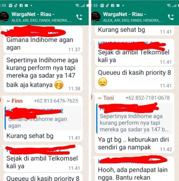 Hal demikian juga terjadi di group WA Warganet Kota Pekanbaru, semua chat anggota group mengeluhkan tentang layanan Telkom Indihome yang putus sambung. Kebanyakan dari anggota group, mengaku sudah melaporkan putus sambung dan lambatnya jaringan ini kepada pihak Telkom, namun kembali kecewa karena tidak mendapat kepastikan kapan jaringan kembali normal.