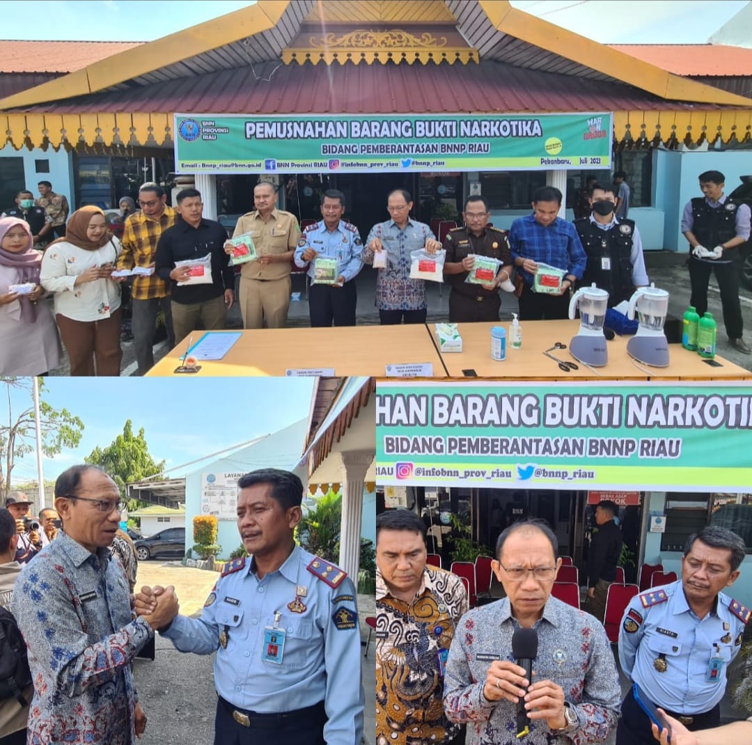 Kepala Lapas Narkotika Rumbai, melaksanakan langsung pemusnahan barang bukti Narkotika dan penandatangan berita acara pemusnahan barang bukti narkotika, bersama jajaran Aparat Penegak Hukum se Kota Pekanbaru yang mengambil tempat di Kantor BNNP Riau.