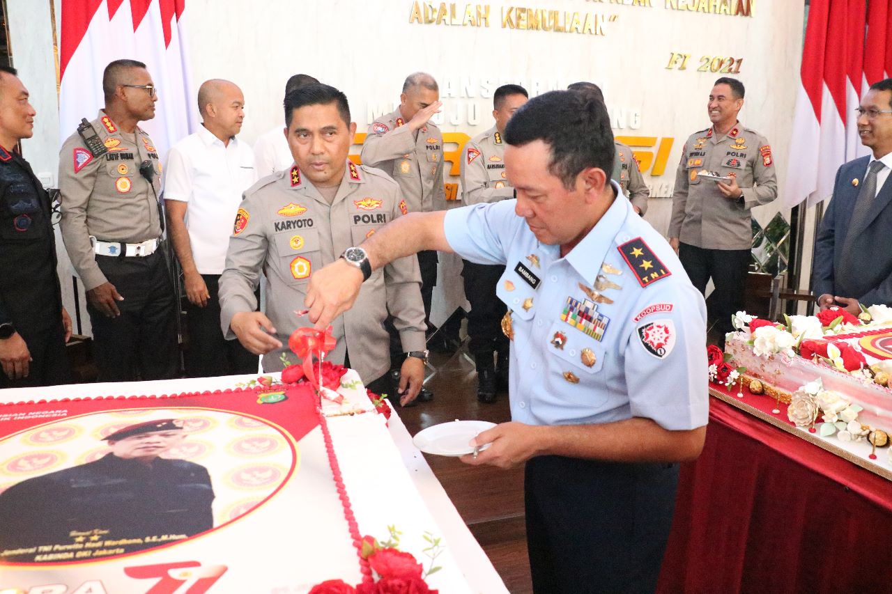 Pada kesempatan itu Pangkoopsud I, Marsda TNI Bambang Gunarto, S.T., M.M., M.Sc., memberikan potongan kue kepada Kapolda Metro Jaya dan menyampaikan doa semoga di usia ke-77 tahun ini, Polri menjadi semakin solid, tangguh, professional dan selalu dekat dengan Rakyat, sementara Pj. Gubernur DKI Jakarta, memberikan potongan kue ulang tahun kepada Wakapolda Metro Jaya Brigjen Pol. Suyudi Ario Seto, SH., S.IK., M.Si.