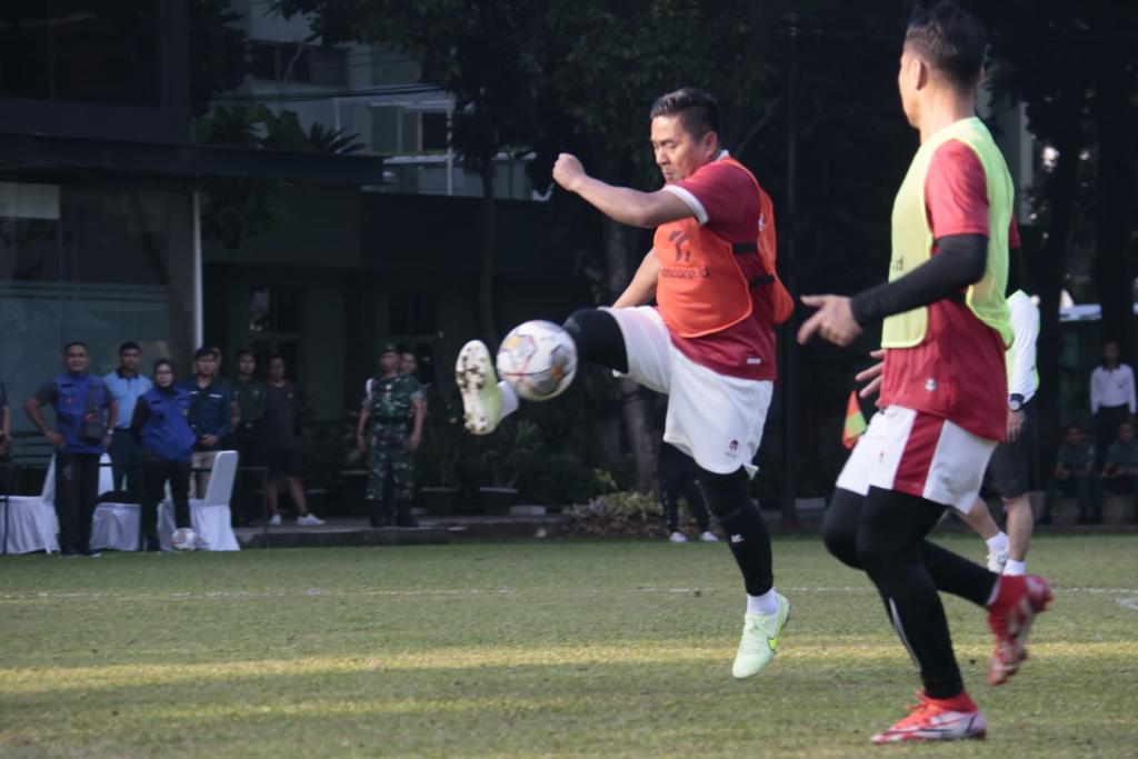 Olahraga bersama kali ini Kodam Jaya menggelar pertandingan sepakbola. Dalam satu tim terdiri dari gabungan TNI dan Polri.