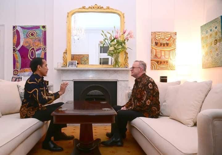 Sydney (HSB) – Presiden Joko Widodo mengakhiri kegiatan kunjungan hari keduanya di Sydney, Australia, dengan melakukan jamuan santap malam bersama Perdana Menteri (PM) Albanese di Kirribilli House. Tiba pada Selasa malam, 4 Juli 2023, Presiden Jokowi dan PM Albanese tampak kompak mengenakan baju batik motif khas Indonesia.