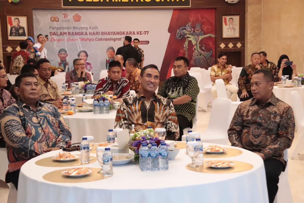POLDA METRO JAYA (HSB) – Wakapolda Metro Jaya Brigjen Pol Suyudi Ario Seto didampingi Kapoksahli Kodam Jaya, Pomdam Jakarta, Waden Lantamal III dan Para Pejabat Utama Polda Metro Jaya melaksanakan kegiatan nonton bareng pagelaran wayang kulit lakon Wahyu Cakraningrat di Aula Lantai 2 Gedung Promoter. Jumat (07-7-2023) malam.