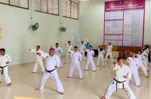 Kepala Lembaga Pemasyarakatan Kelas IIA Binjai , Theo Adrianus, A.Md.I.P., S.H., M.H beserta jajaran petugas mengikuti kegiatan Latihan bela diri Karate-Do Tako bertempat di Aula Lapas Binjai, kemarin.