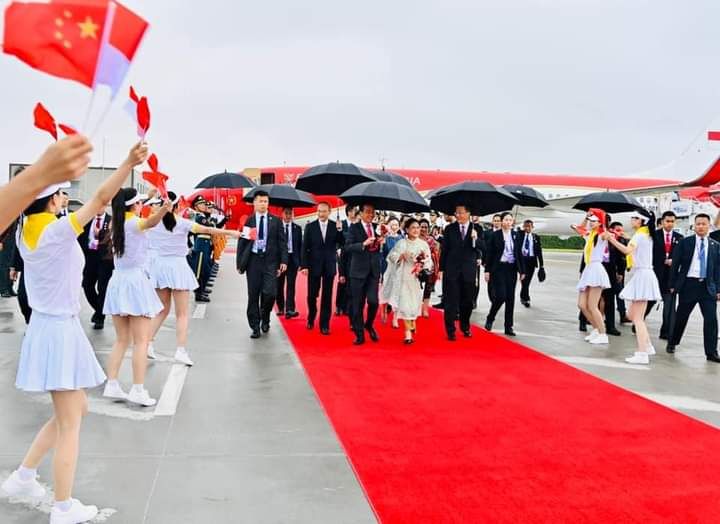 Hariansinarbogor.com || Hujan gerimis sambut ketibaan Presiden Joko Widodo dan Ibu Iriana di Bandar Udara Internasional Tianfu, Kota Chengdu, Provinsi Sichuan, Republik Rakyat Tingkok (RRT), pada Kamis, 27 Juli 2023.