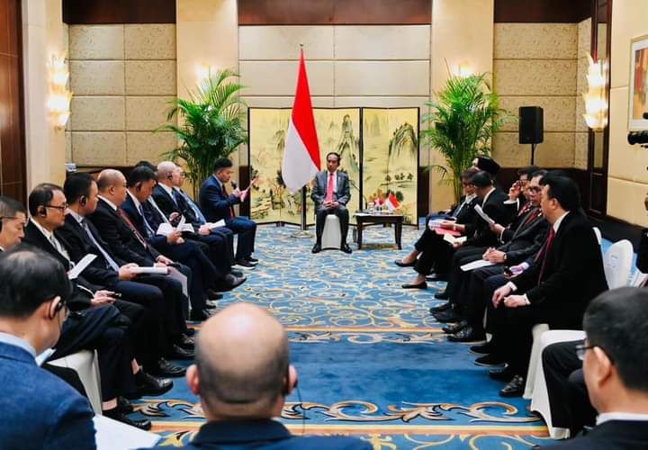 Chengdu (HSB) – Presiden Joko Widodo menggelar pertemuan bisnis bersama Kamar Dagang Indonesia di Tiongkok (INACHAM) dan sejumlah pengusaha Tiongkok di Shangri-La Hotel, Chengdu, Republik Rakyat Tiongkok (RRT), pada Jumat, 28 Juli 2023. Dalam pertemuan tersebut, Presiden Jokowi menekankan komitmen Indonesia untuk menjaga investasi tetap stabil dan berjalan baik.