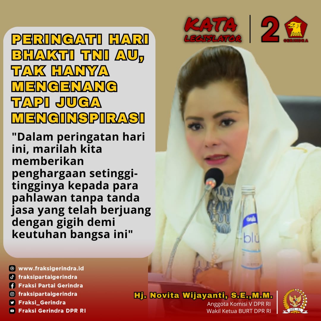 Jakarta (HSB) – Anggota DPR RI dari Fraksi Partai Gerindra Novita Wijayanti berharap peringatan Hari Bhakti Tentara Nasional Indonesia Angkatan Udara (TNI AU) menjadi momen penting dalam mengenang jasa dan pengabdian seluruh prajurit.